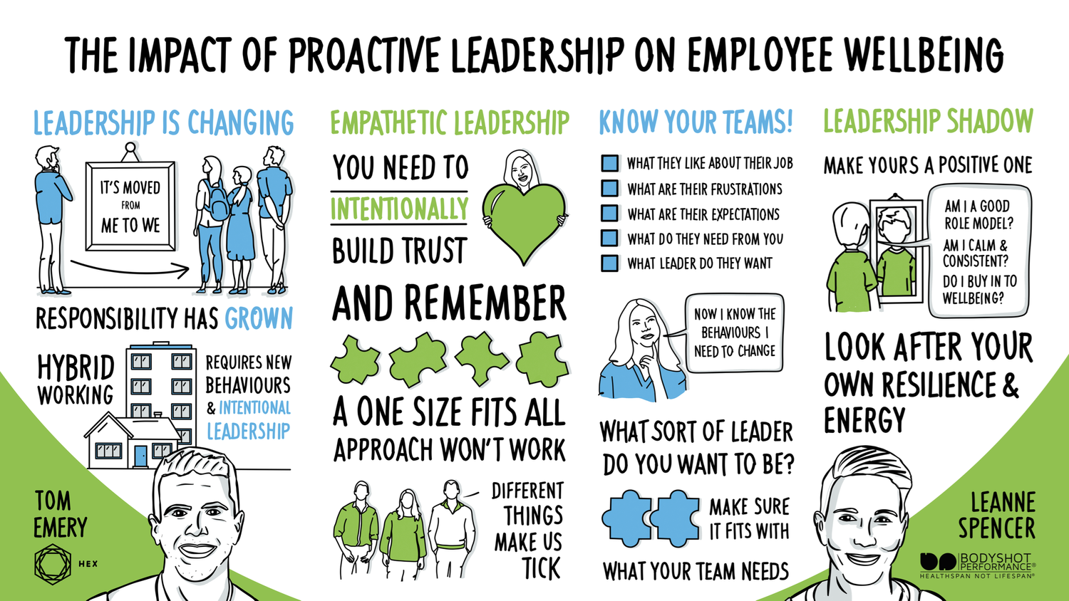 Tom recently chatted with Leanne Spencer of the amazing Bodyshot Performance about the impact of leaders on the wellbeing of their team. It was an interesting discussion and you can watch it here. If you haven’t got time, there’s a handy graphic below with some of the key takeaways!